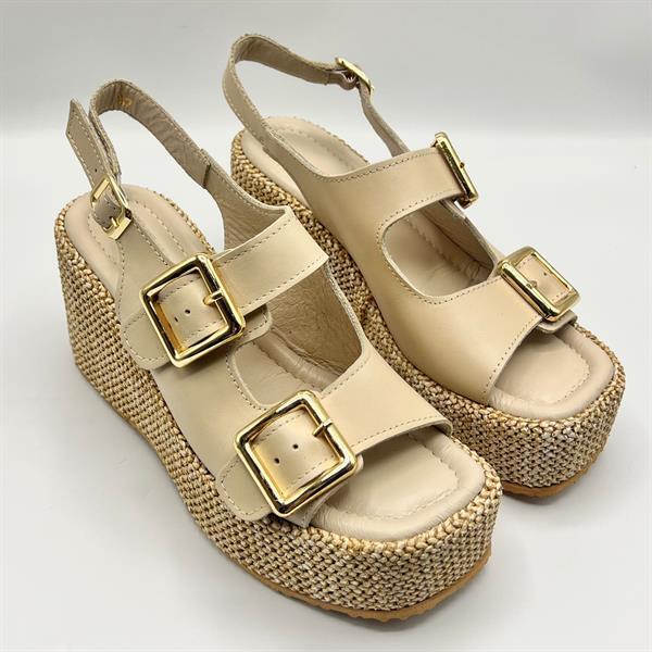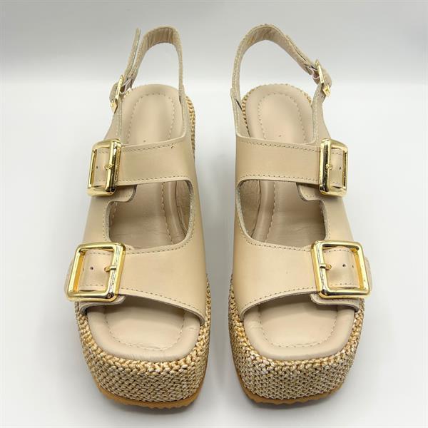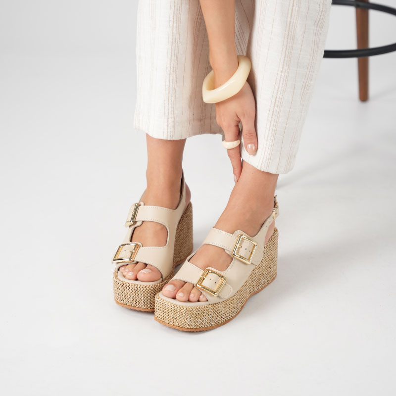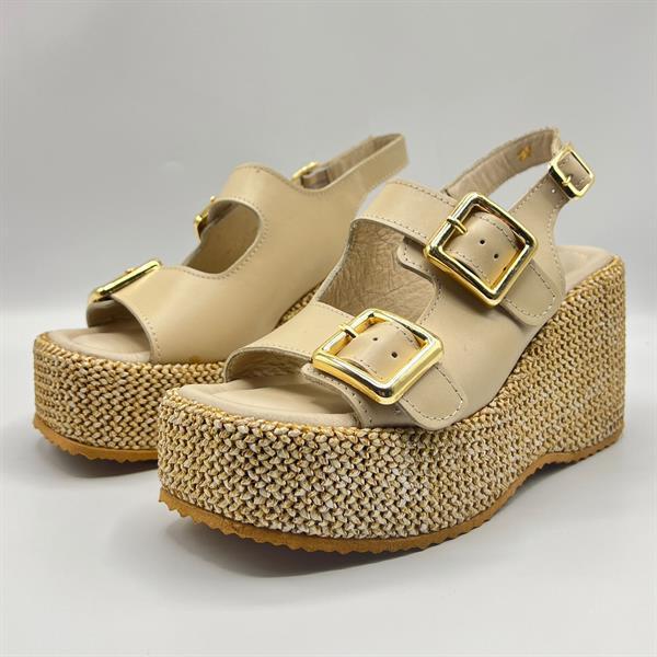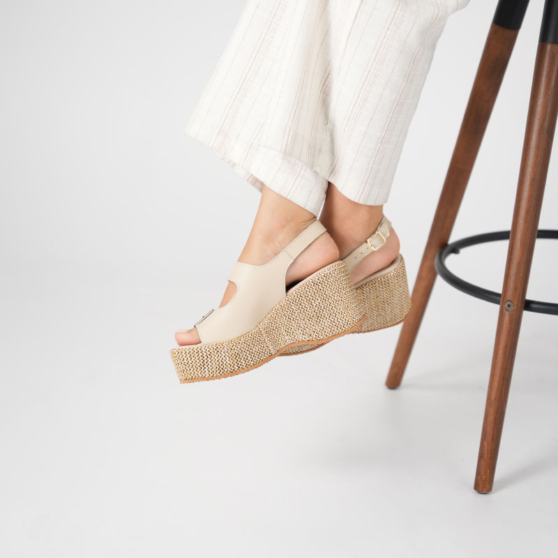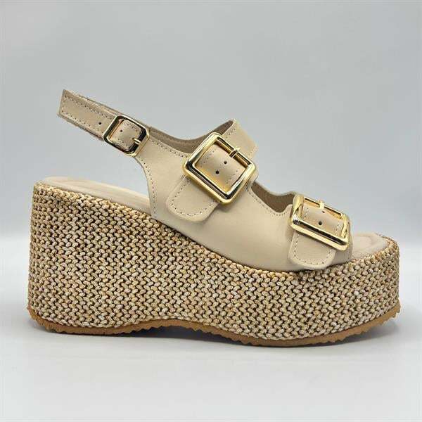 Zamansız bir şıklık ve doğal bir zarafet arayanlar için tasarlanan Frida Bej Deri Dolgu Topuk Sandalet, yaz aylarının en kurtarıcı parçası olmaya aday. Gerçek deri iç ve dış materyali, ayarlanabilir gold tokası ve 7.5 cm topuğu ile stilinize konfor katıyor. Hasır sargı kaplamalı EVA tabanı sayesinde hem hafif hem de sağlam. 4 cm platformu ile ayak anatomisine destek sağlar. Tam kalıptır, kendi numaranızı tercih edebilirsiniz.