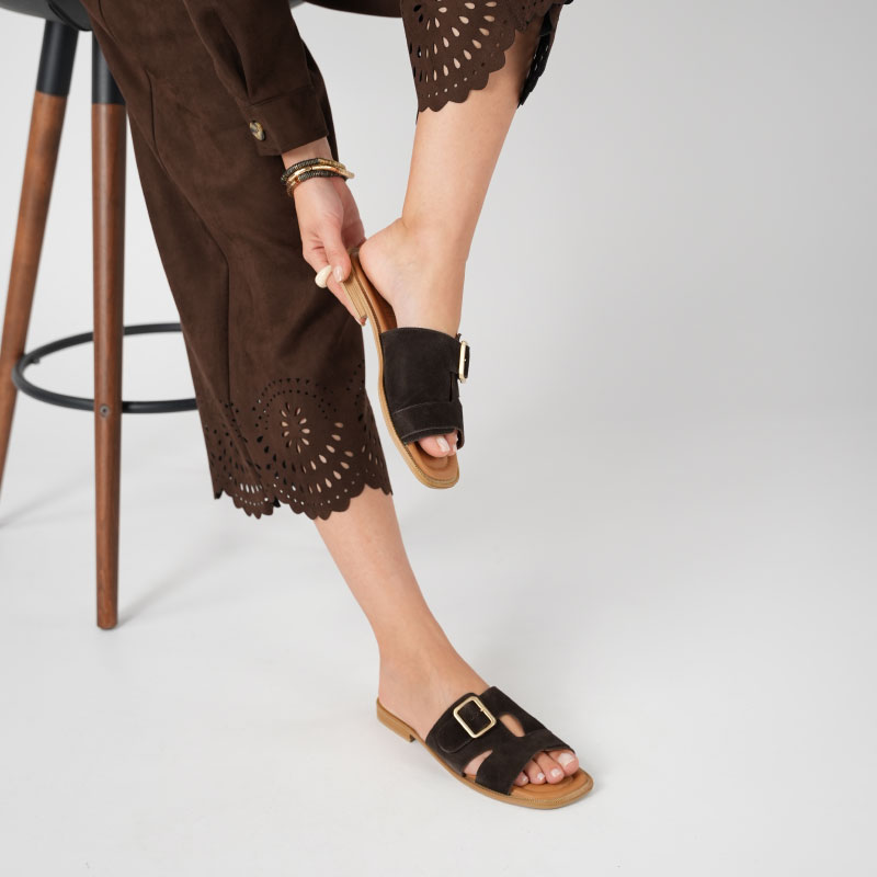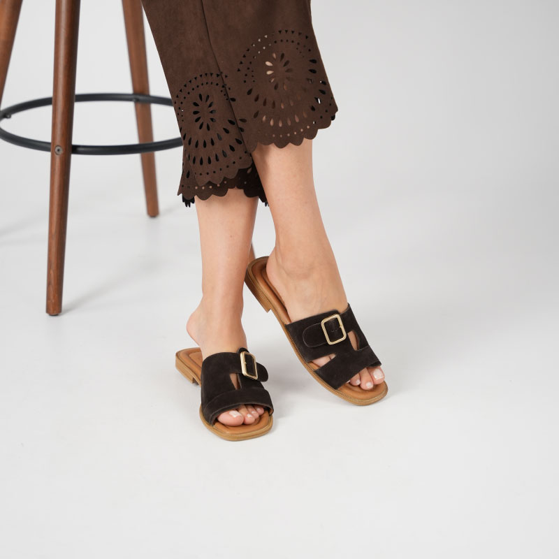 Şıklığı ve rahatlığı bir araya getiren Bellini kahve süet tokalı terlik, %100 el işçiliği ve gerçek deri kalitesiyle öne çıkıyor. 2 cm termo tabanı sayesinde esnek ve gün boyu konforlu bir deneyim sunar. Minimal tasarımıyla şehir hayatına uyum sağlayan bu model, özellikle yaz aylarında hem tarz hem de rahatlık arayan kadınların favorisi olacak. Günlük kombinlerinize sıcak bir kahve dokunuşu katın!