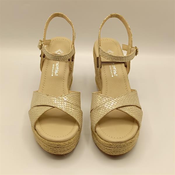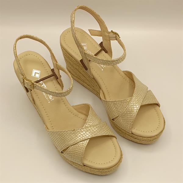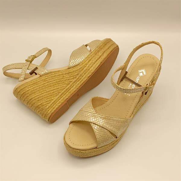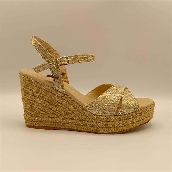 Camelia Gold Simli Deri Dolgu Topuk Sandalet, zarafeti ve şıklığı bir arada sunar. %100 hakiki deri dış ve iç materyali ile kaliteli bir kullanım deneyimi sağlarken, altın rengi simli dokusu ile her adımda ışıldamanızı sağlar.