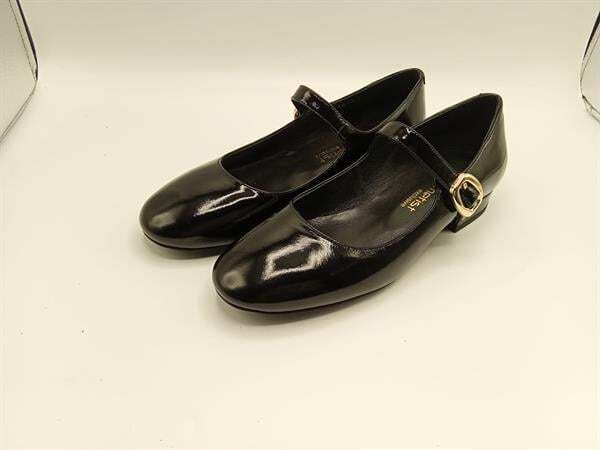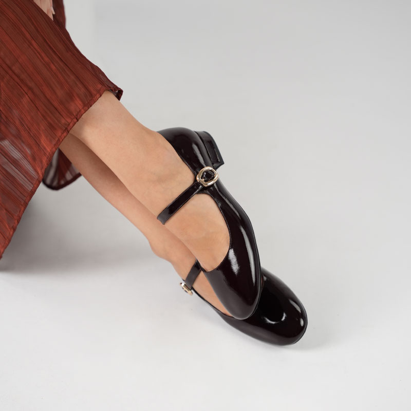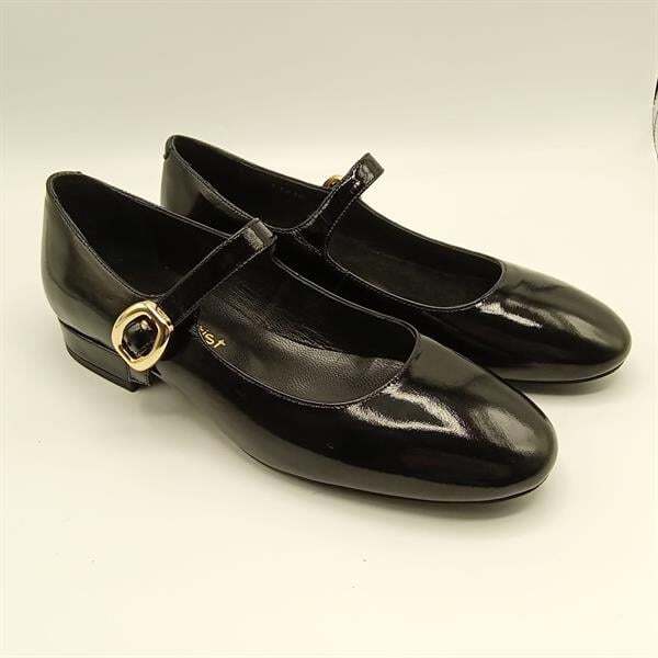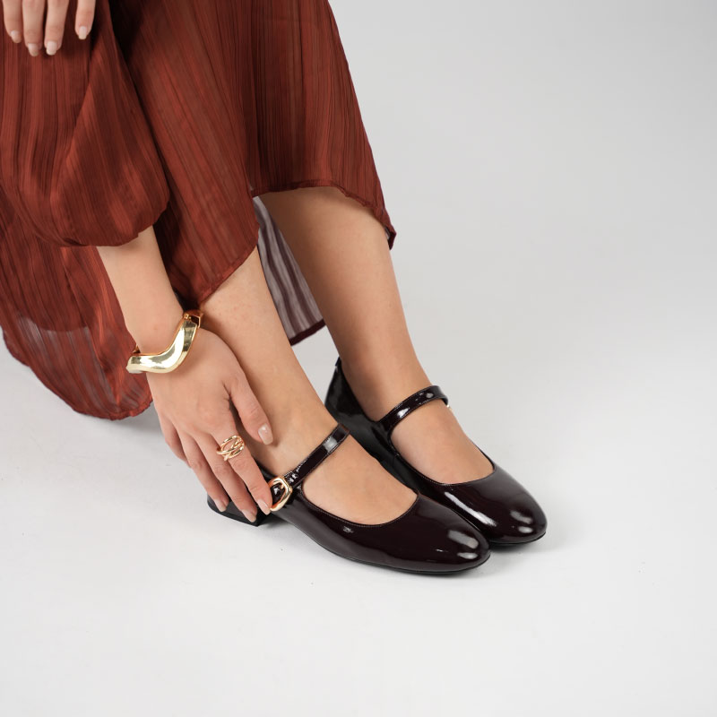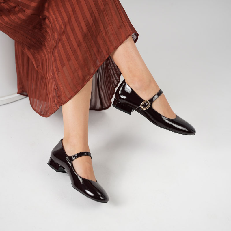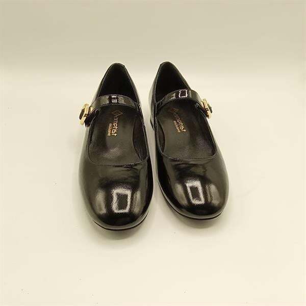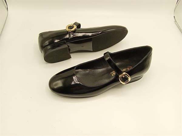 Parlak siyah gerçek deri ile hazırlanmış bu özel model, 2 cm kısa topuğu, küt burun formu ve altın tokalı bilekten bağlamasıyla modern bir görünüm sunar. Günlük kombinlerden özel günlere kadar her ana uyum sağlar. Kararma yapmayan metal toka ve kaymaz TPU tabanı ile tam konfor sağlar.